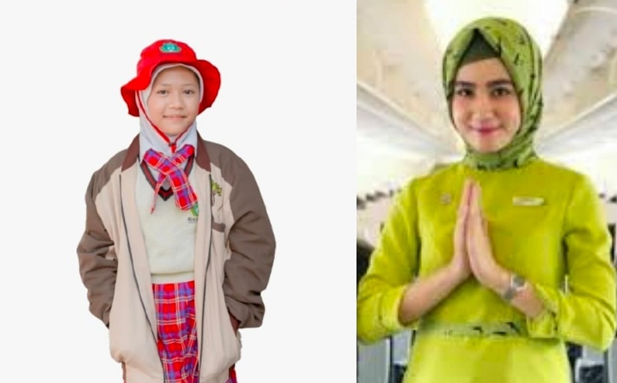 Tampilan Saiza Mauliyah Yanti (kiri) saat menjadi pramugari sesuai cita-citanya (kanan)