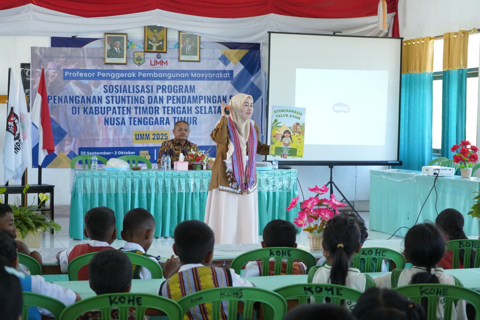 Dengan penuh semangat, ia mengangkat buku bertajuk “STEM: Rahasia Telur Ayam”. Anak-anak menyimak dengan penuh perhatian, sementara di belakang terpampang spanduk besar bertuliskan Sosialisasi Program Penanganan Stunting dan Pendampingan di Kabupaten Timor Tengah Selatan. Momen itu menjadi potret nyata bagaimana Kampus Putih hadir membawa ilmu sekaligus harapan di Nusa Tenggara Timur (NTT), 30 September hingga 2 Oktober 2025.