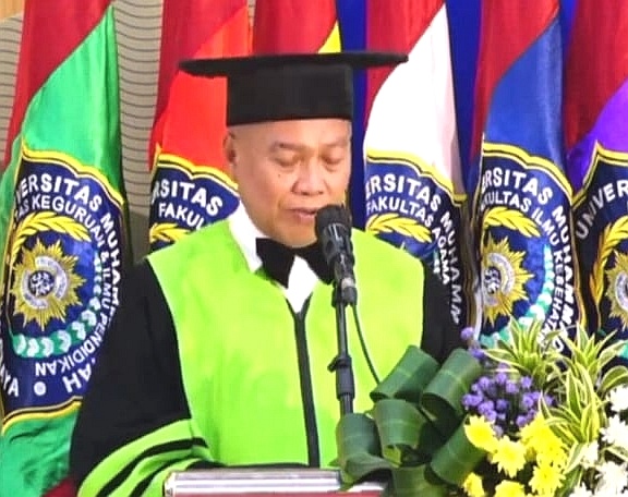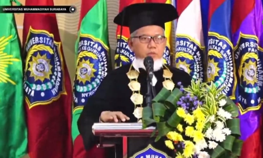 “Sidang terbuka Senat Universitas Muhammadiyah Surabaya dengan acara pengukuhan Guru Besar Profesor Doktor dokter Sukadiono Magister Manajemen, Guru Besar dalam bidang ilmu Fisiologi Olahraga tahun 2025, dibuka dengan bacaan basmalah,” ucap Mundakir tegas di hadapan para hadirin.