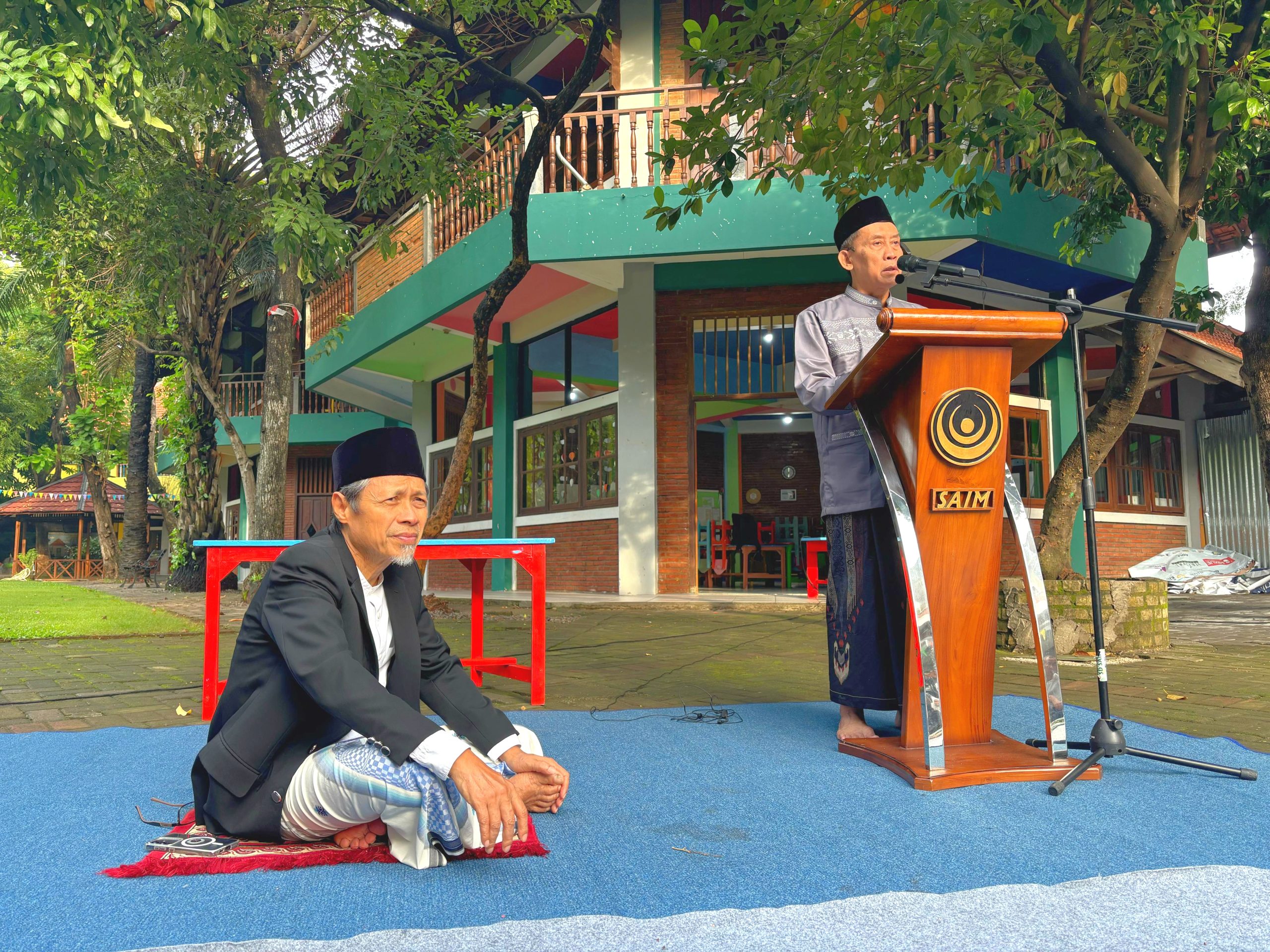 Lapangan SAIM pagi itu disulap menjadi ruang ibadah terbuka. Dalam suasana yang hangat dan penuh kekeluargaan, salat Idulfitri dipimpin oleh Dr. Moh, Sulthon Amien, M.M., pendiri dan pemilik SAIM. Jemaah yang terdiri atas guru, siswa, dan keluarga besar SAIM tampak khusyuk menunaikan ibadah dengan penuh suka cita.