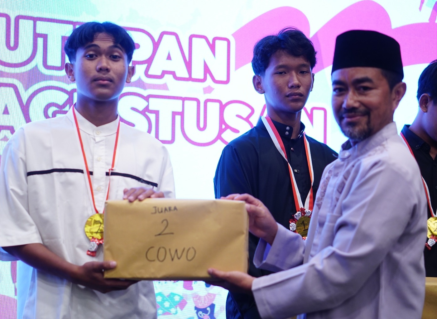 Rangkaian acara semakin hangat ketika para ustaz dan ustazah ikut naik ke panggung, menyerahkan hadiah bagi para pemenang lomba. Keterlibatan para pembimbing menghadirkan nuansa kebersamaan yang kental, seolah meneguhkan bahwa keberhasilan santri adalah kebanggaan bersama.