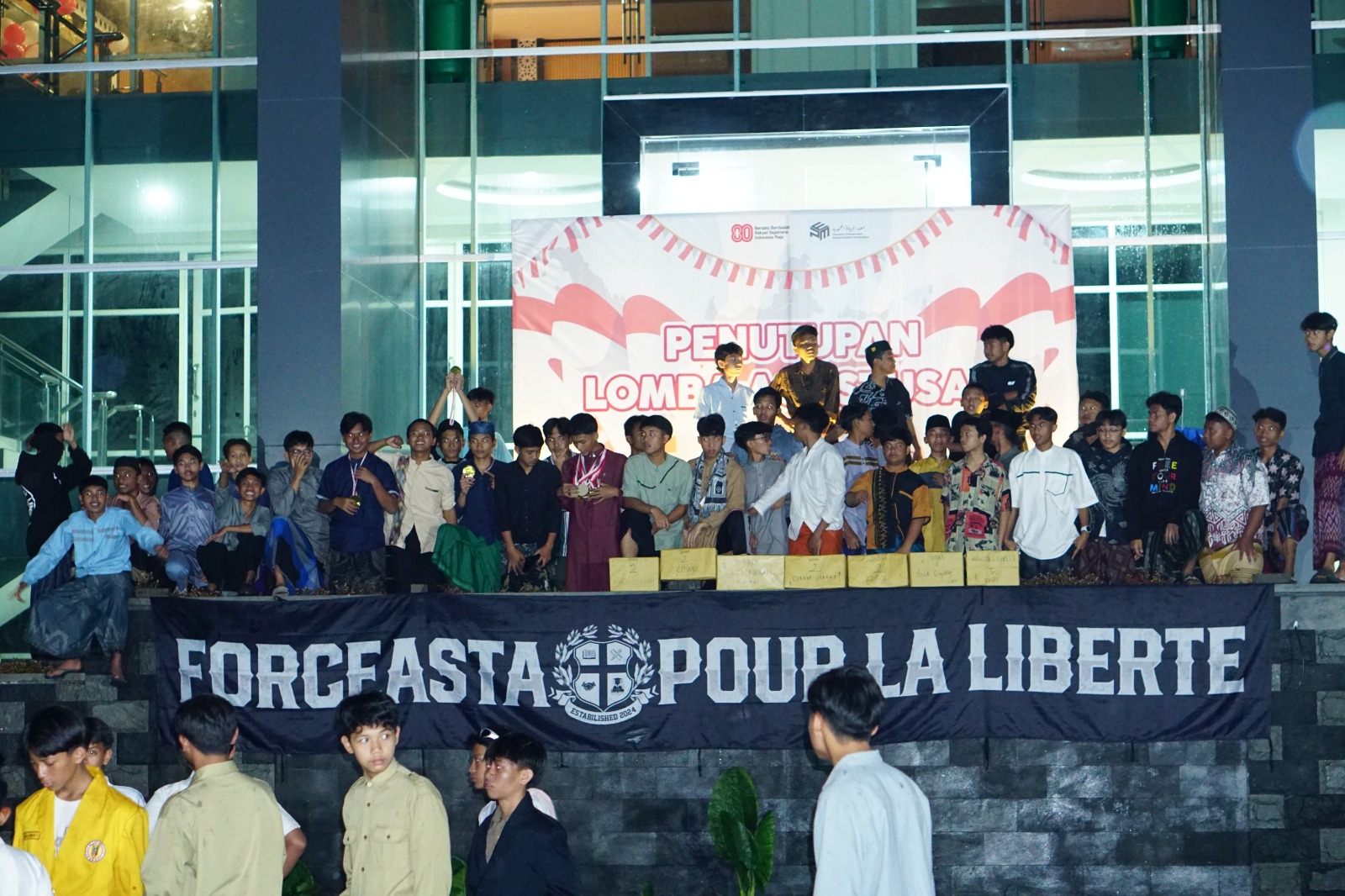 Latar belakang panggung dihiasi spanduk besar bertuliskan “Penutupan Lomba Agustusan”, sementara di bagian depan terbentang spanduk hitam bertuliskan “FORCEASTA POUR LA LIBERTE” yang menjadi identitas kebanggaan santri.