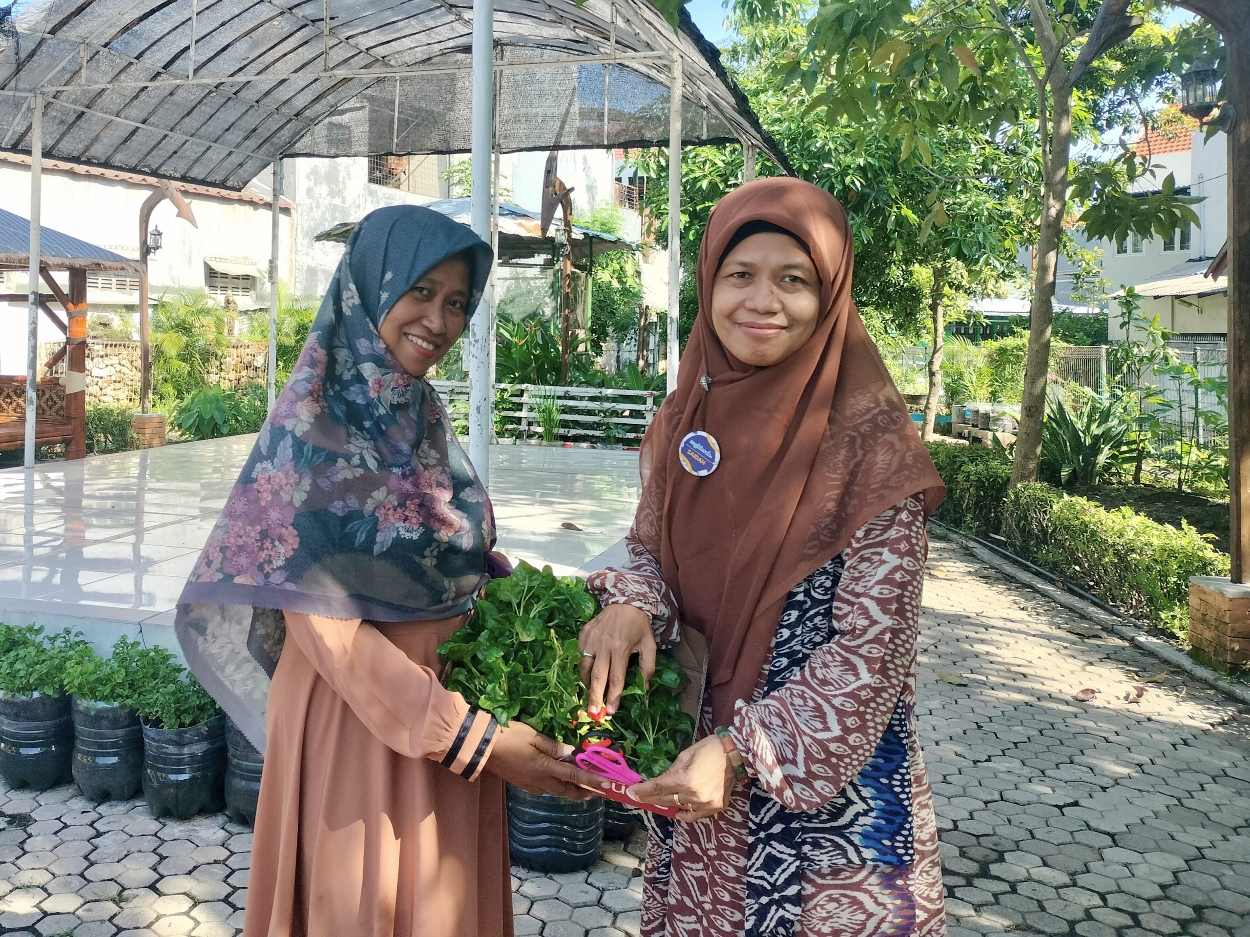 Agenda ini menjadi kejutan pagi sebelum mengerjakan tugas menyusun modul ajar Perencanaan Pembelajaran Mendalam (PPM). Ya, siswa telah libur semester. Hanya guru dan karyawan yang masuk sekolah. Di antara kerumunan guru, tampak Saidah, S.Pd. dan Khofifatur Rohmah, S.Pd. yang sangat bersemangat menuju kebun.