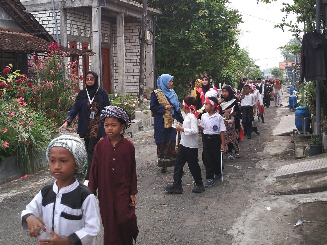 Sepanjang perjalanan, iring-iringan siswa menarik perhatian warga. Mereka menyambut rombongan dengan lambaian tangan dan senyum bangga.
