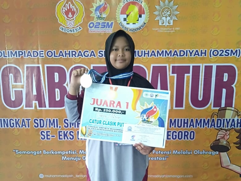 Dua siswa MTs Muhammadiyah 3 Sumberrejo, Apsara Putri Pertiwi dan Muhammad Rayhan Saputra, sukses memborong medali emas catur dan lari 100 meter pada O2SM se eks-Keresidenan Bojonegoro 2025 di Lamongan.