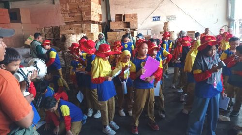 Siswa kelas III Sekolah Kreatif Baratajaya mengikuti kegiatan outdoor learning di gudang pengemasan milik PT Andalan Pasifik Samudra, Surabaya, Kamis (16/4/2026). (Tagar.co/Ahmad Mahmudi)