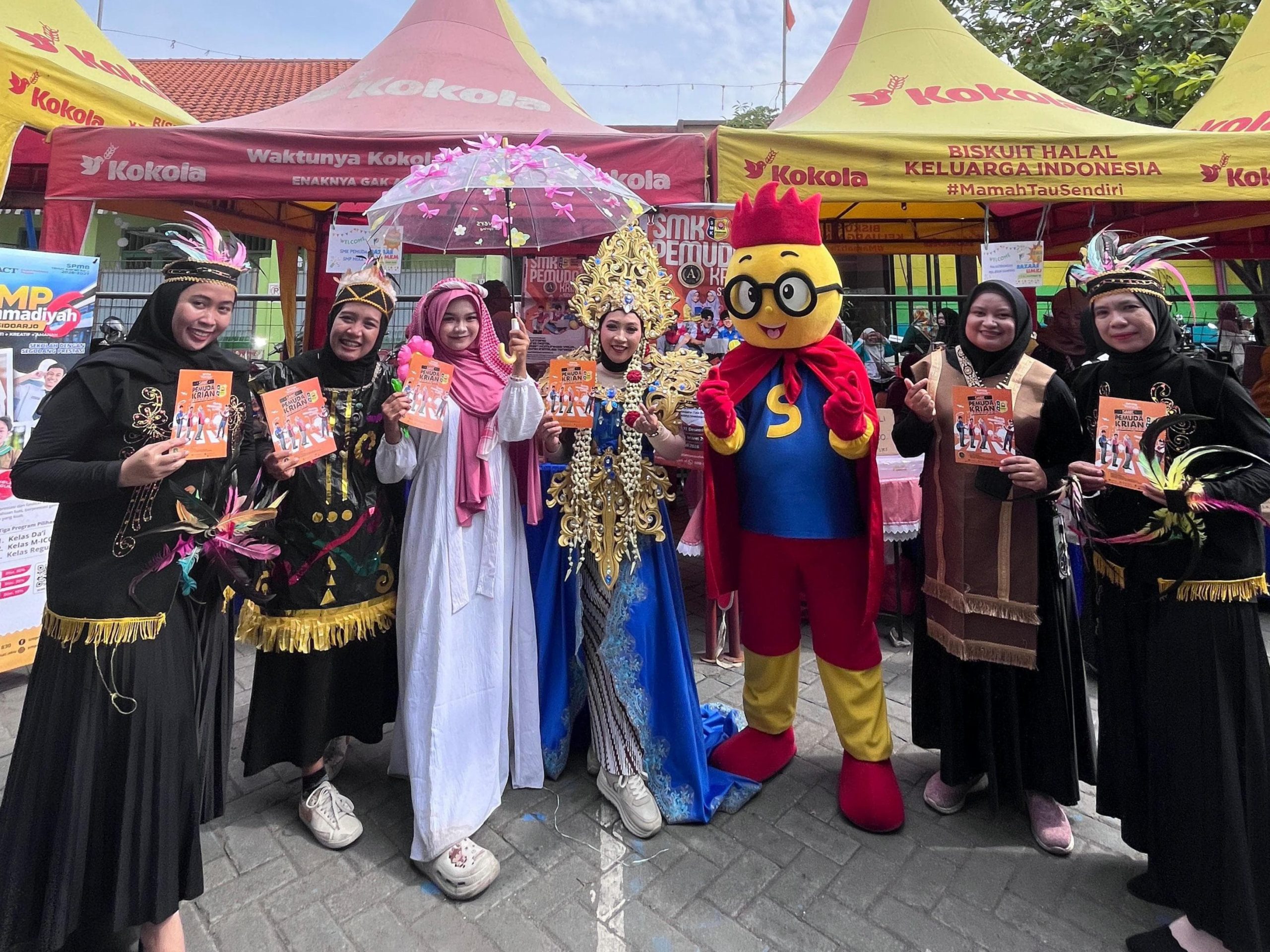 Tim SPMB SMK Pemuda Krian bersama maskot sekolah tampil dengan keunikan busana adat dan kostum karnaval pada perayaan Milad Ke-113 di Muhammadiyah Krian, Sidoarjo, Ahad (9/11/2025). (Tagar.co/Wiji Bunga Asri)