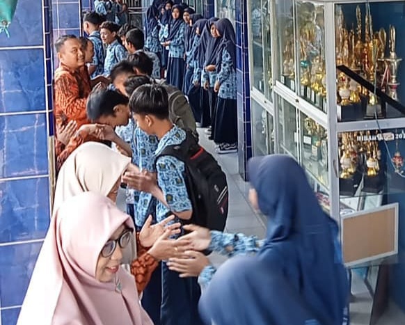 Hari pertama sekolah usai Idulfitri diwarnai haru. Siswa MTs Muga Sumberrejo bersalaman, berdoa, dan saling memaafkan dalam halalbihalal bersama guru di halaman sekolah.