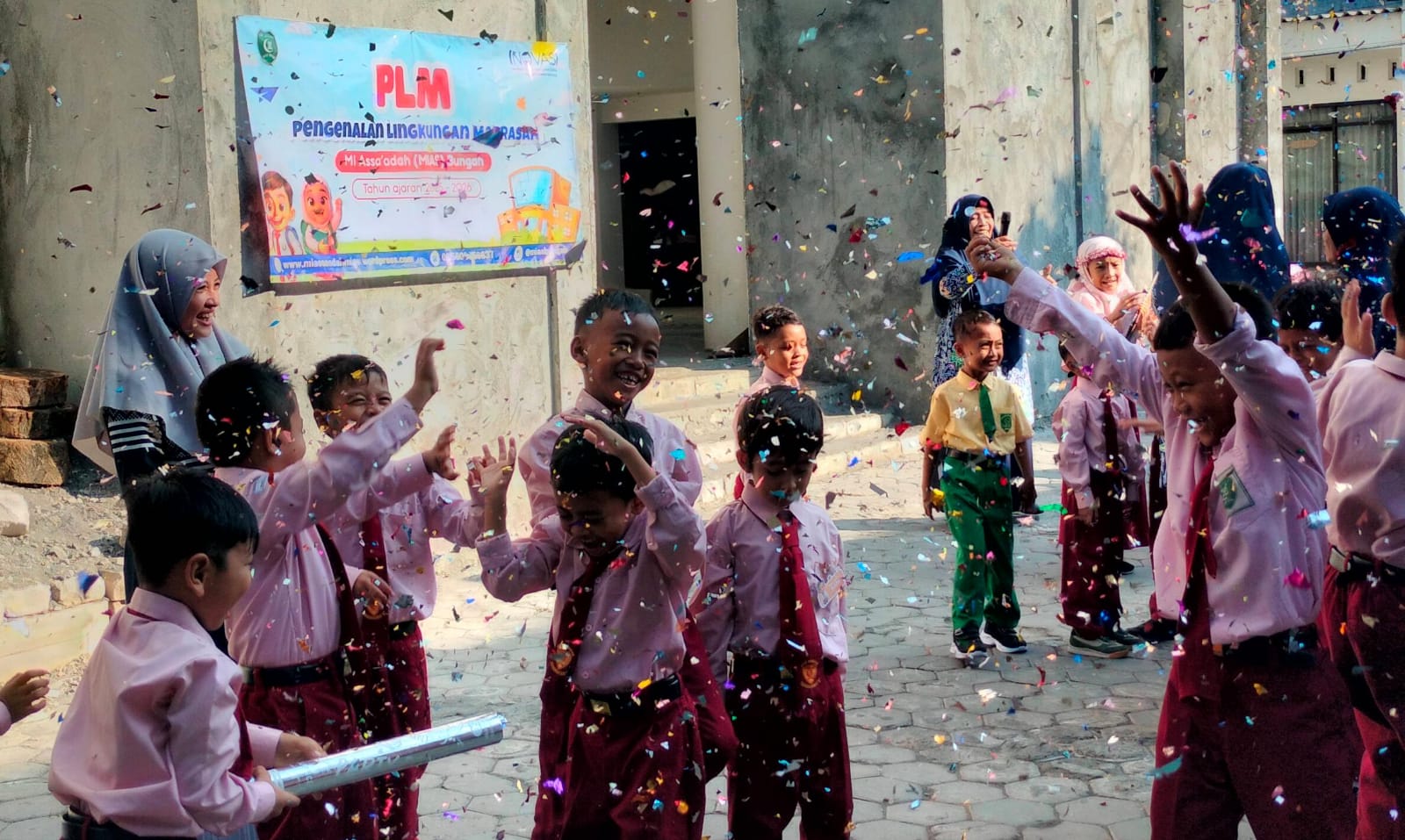 Suasana semakin meriah saat party popper aneka warna meledak ceria di udara. Letupan riang dan jatuhan confetti menambah semarak. Ini menandai mulainya kegiatan Pengenalan Lingkungan Madrasah (PLM) di Mias Bungah.