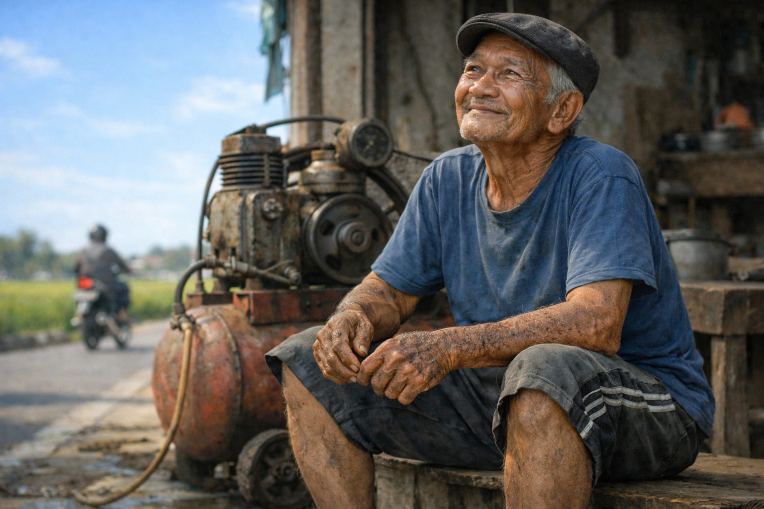 Di balik kompresor tua dan tangan berlumur oli, Mbah Junaidi menambal lebih dari sekadar ban—ia menambal penyesalan hidup dan menitipkan nasihat bagi generasi muda.