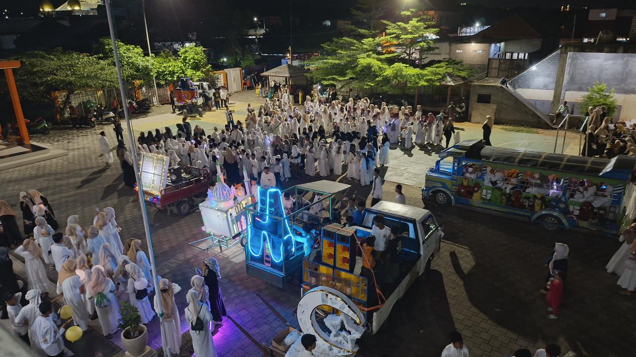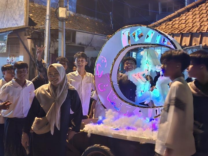 Para siswa membawa lampion bernuansa Islami, pernak-pernik Ramadan berhias lampu warna-warni, serta miniatur bulan dan bintang yang melambangkan kemuliaan bulan suci. Cahaya lampu yang berpadu dengan busana dominan putih dan hitam menciptakan nuansa religius yang hangat di sepanjang rute pawai.