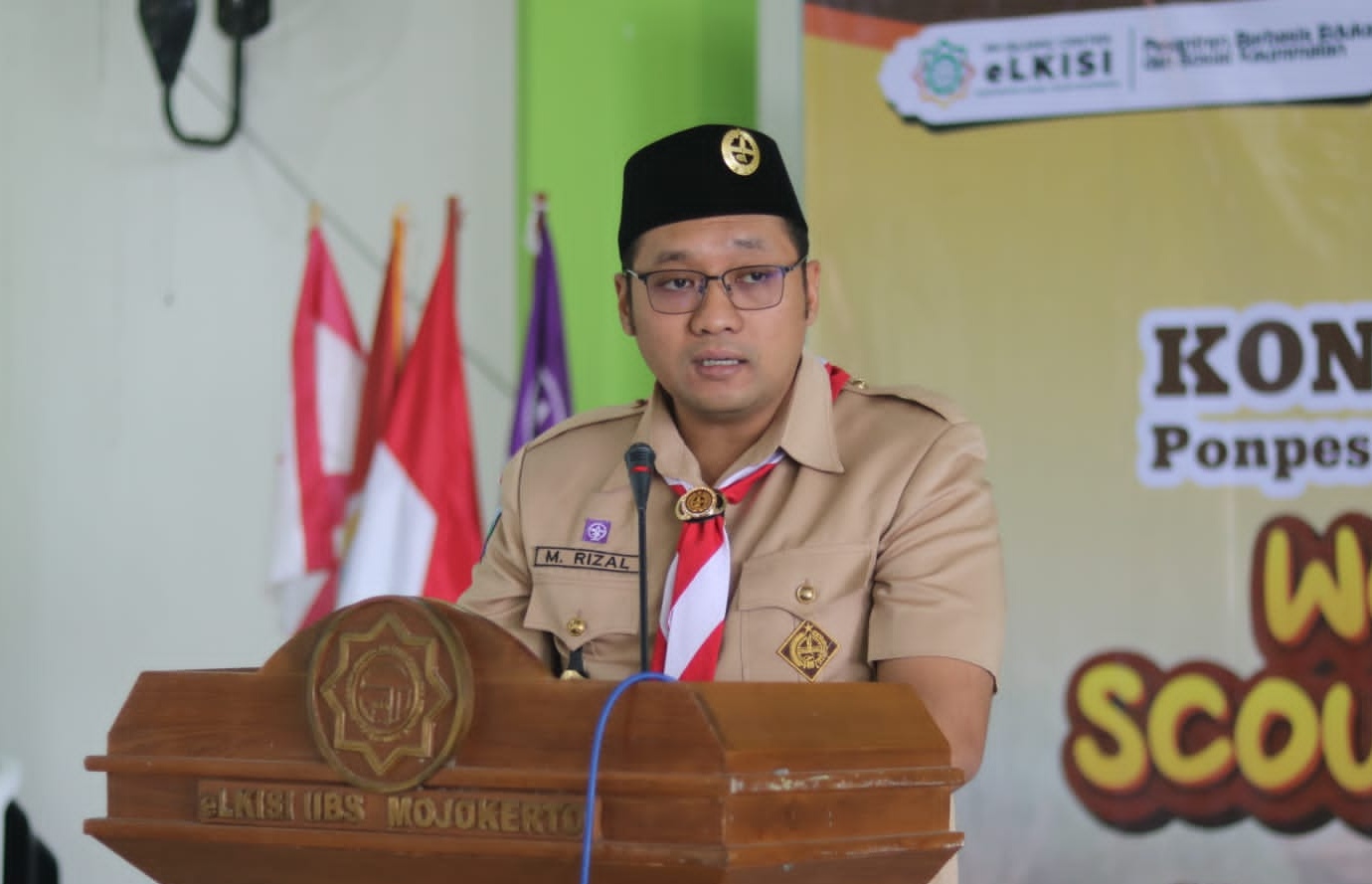 Dengan berseragam pramuka lengkap, kopiah hitam, dan berbalut selempang merah putih di leher, Wabup Rizal berdiri di mimbar kayu berlogo eLKISI IBS Mojokerto.